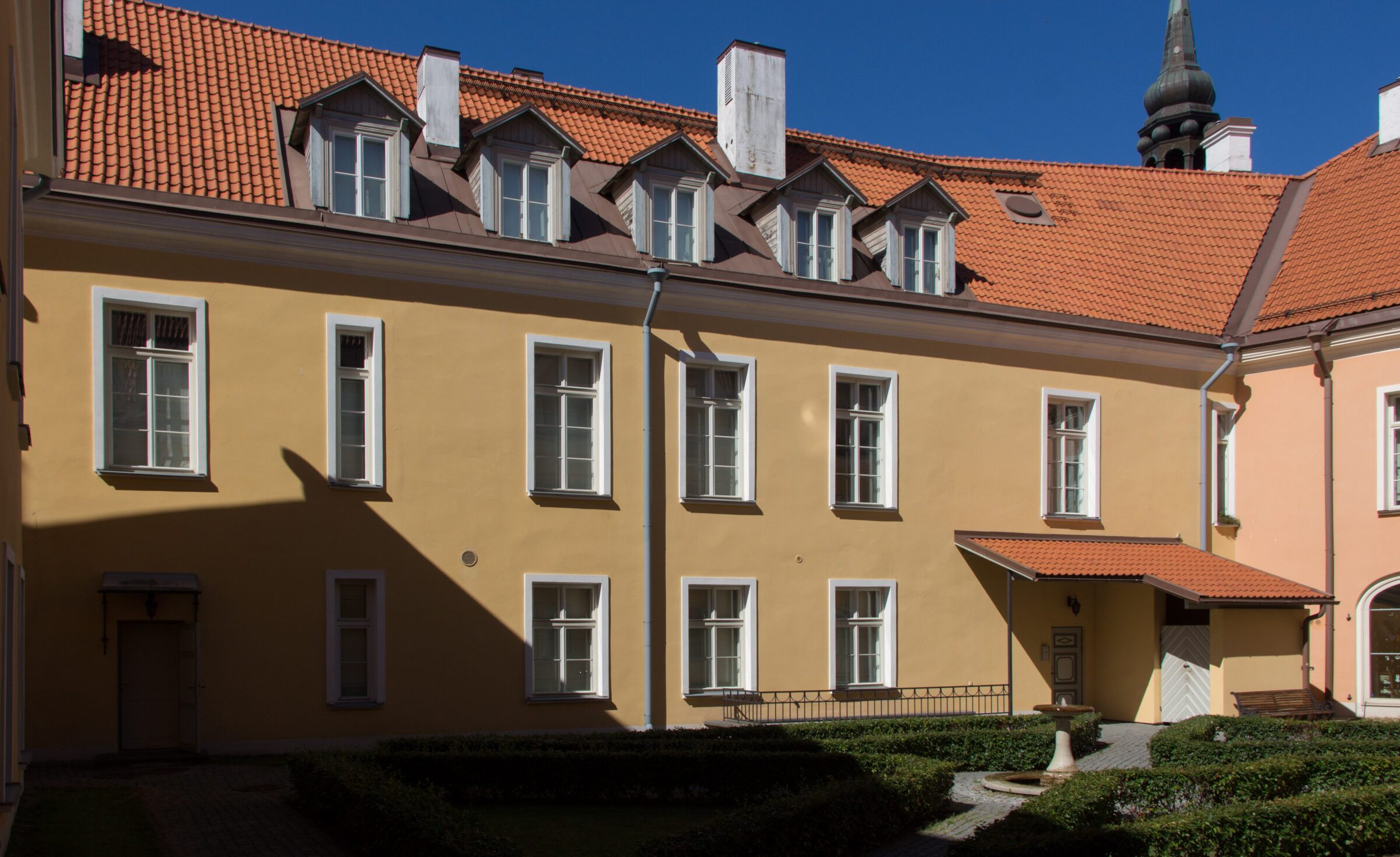 The building complex at Kohtu 2 / Kiriku Square 2 / Piiskopi 2 / Pikk Jalg 16 developed over the course of the 18th and 19th centuries. The noble palace located on the Kohtu Street side of the plot was built in 1798 for the Kaulbars family. It was erected on the walls of medieval buildings destroyed in the great Toompea fire of 1684. A classicist wing was later added along Piiskopi Street in the 19th century, modeled after the original palace—this building now houses the Hungarian Institute. Additional structures were built around the courtyard in the 19th and 20th centuries, and the complex also included an ornamental garden facing Pikk Street. After the Kaulbars family, the estate belonged to the noble Tiesenhausen family. In the 1930s, the complex was converted into apartment buildings, and following damage during World War II, the buildings were restored in that same function.