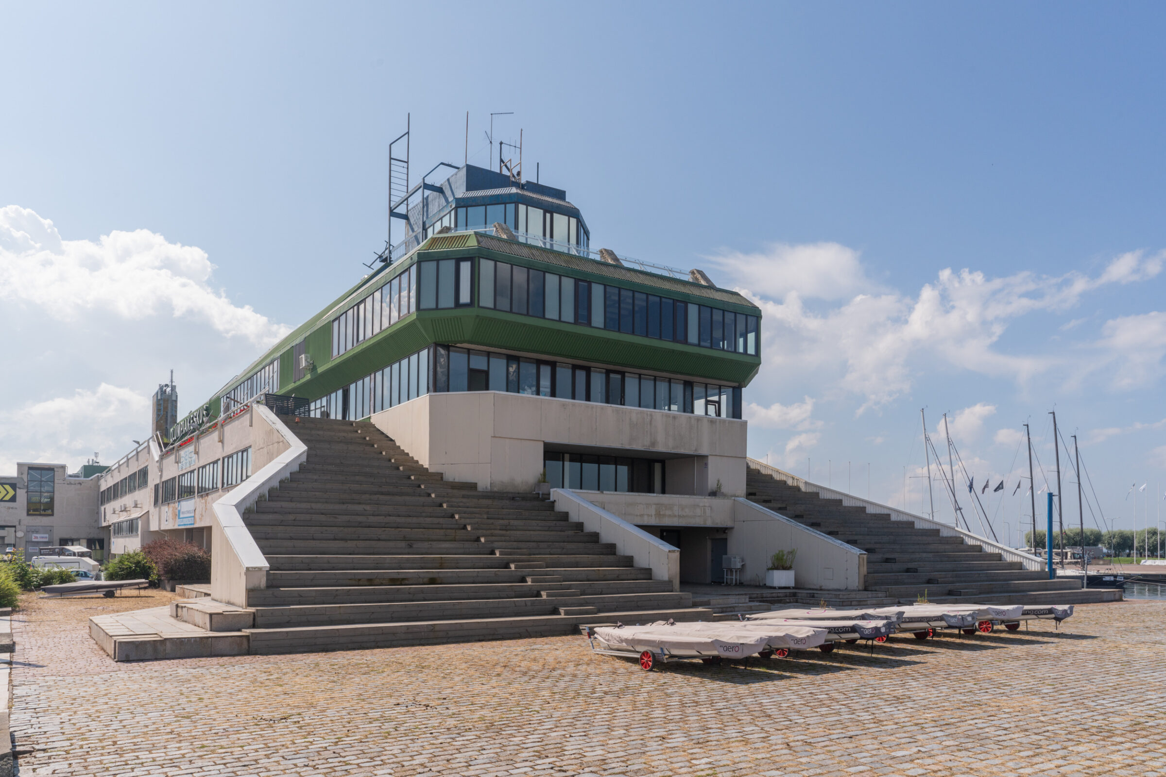 The most important building in the construction program of the 1980 Olympic sailing regatta was the Pirita Olympic Yachting Centre. The complex, designed by Avo-Himm Looveer, Henno Seppmann, and Peep Jänes, was completed in 1980. The symmetrical layout along a longitudinal axis, sectional structure, and multilayered volumes — including the rowing boathouse, chapel tower, and the so-called interclub — give the complex a strong spatial identity. The yacht club, along with the Olympic flame platform and ceremonial square, is located on the peninsula, while the spectator stands are situated on the opposite bank of the river. The hotel section stands out with its slanted wall surfaces and striking red balcony tubes. The complex also included a full-sized sports hall, a medical center, and boat-building workshops.